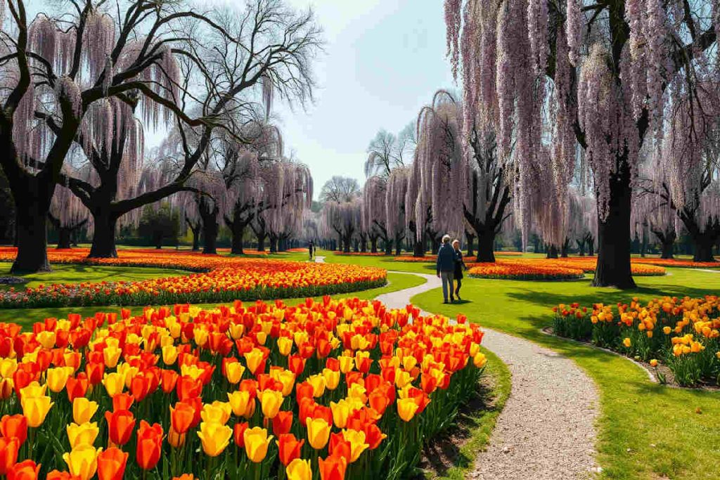 La primavera è il momento clou, con la Settimana del Tulipano che anima il parco con oltre 80.000 bulbi e sessantacinque varietà. Il Labirinto dei Tulipani, un percorso di 400 metri, è il cuore della fioritura, tra colori accesi e profumi forti.
